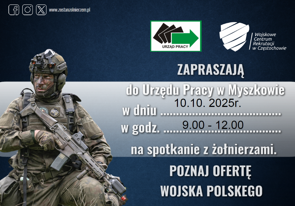 Informacja: Przypominamy, że Powiatowy Urząd Pracy w Myszkowie organizuje spotkanie z przedstawicielami Wojskowego Centrum Rekrutacji w Częstochowie.